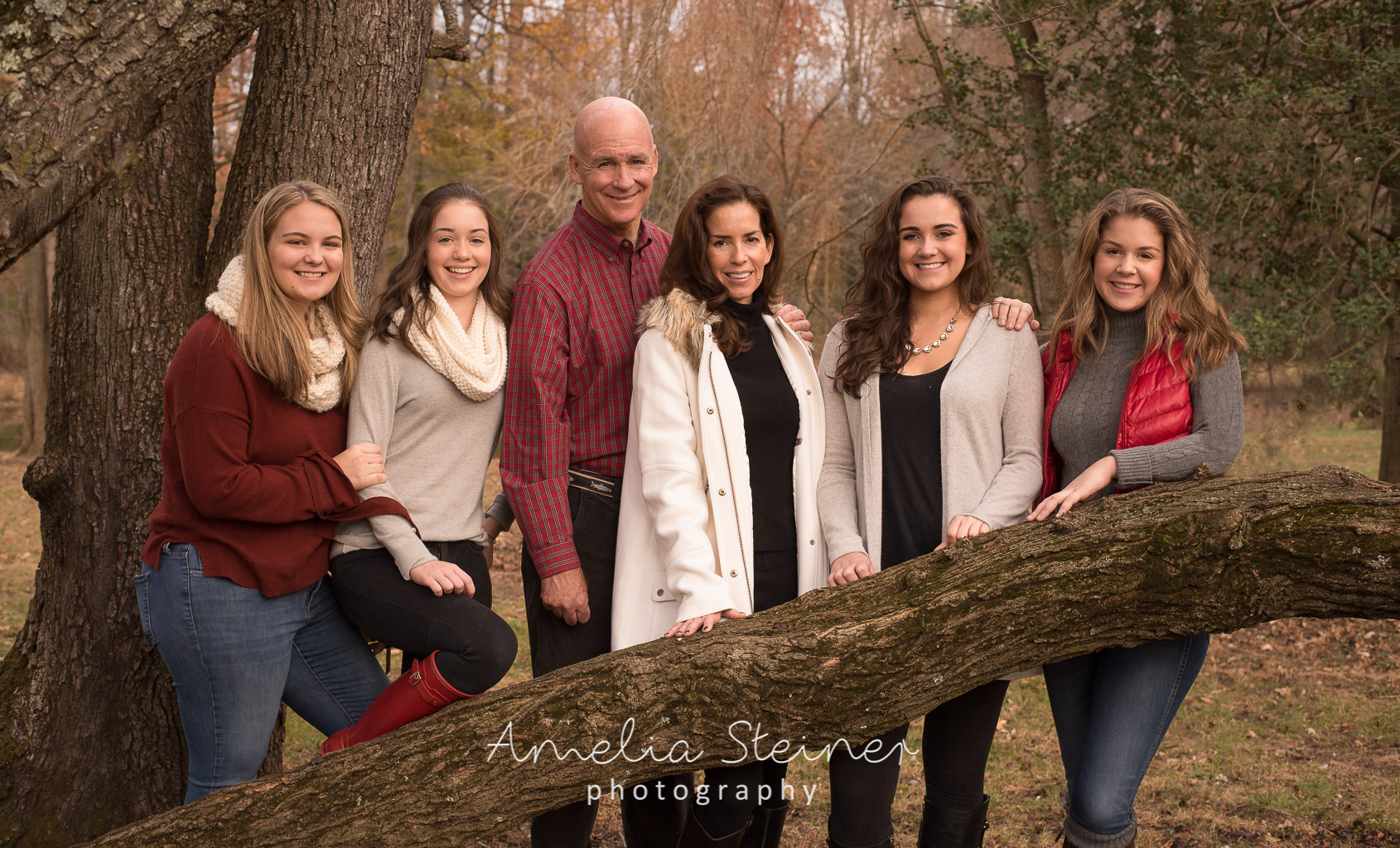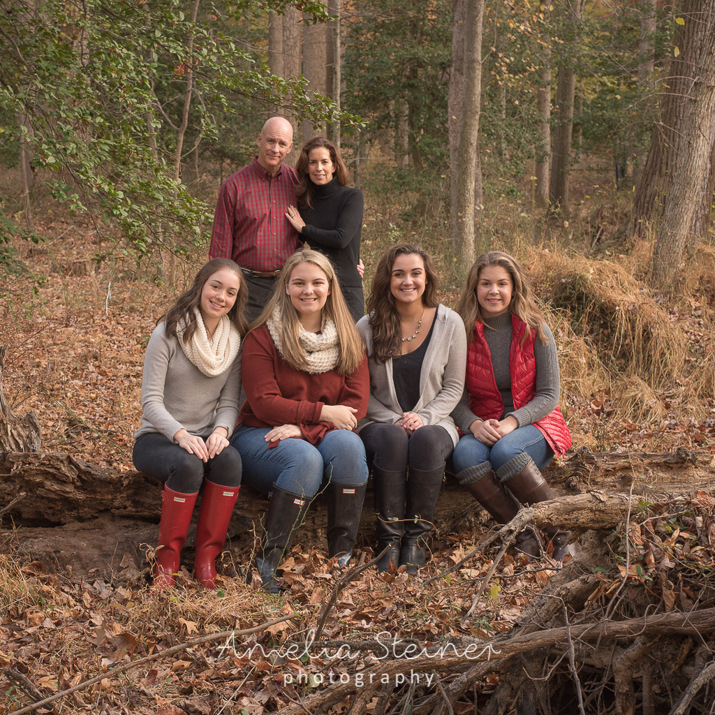 Not only are families busy, but with college kids away at school and high school students often super scheduled, it can be a challenge getting everyone together for family photos. Planning ahead, keeping it simple and sometimes close to home helps to get it done without being disruptive or too time consuming. I enjoyed working with this family to make it an easy, fun moment one afternoon this fall. We found a location with open space, beautiful trees and natural outdoorsy features. They chose relaxed and casually coordinated clothes, but with the emphasis on individual choice and style. The weather was wonderful and still warm enough to enjoy being outside without being bundled up in hats, scarves and gloves. I loved showing the connection between sisters and their playful family bonding was fun to show and gave great naturally happy expressions.