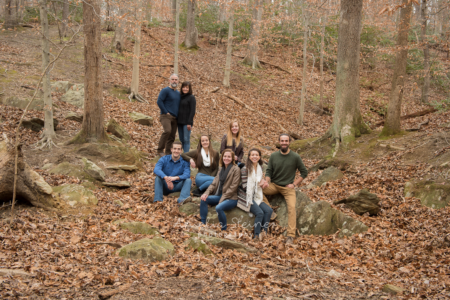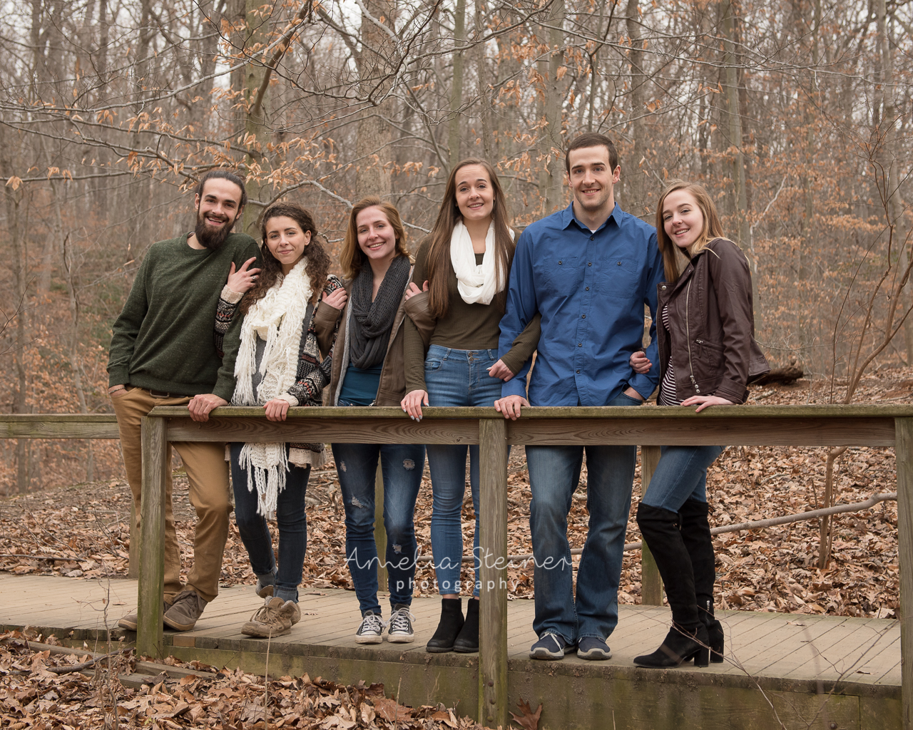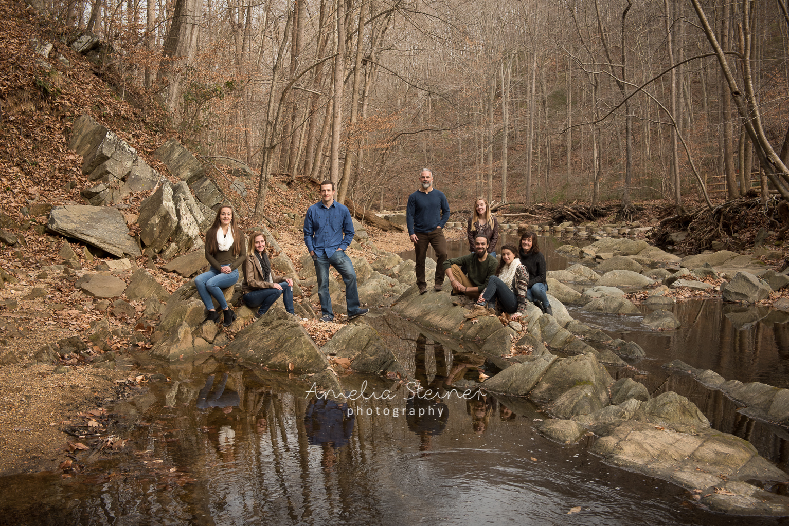 One of the best things about living in Northern Virginia is the easy access to and availability of great nearby locations for walks, hikes, runs… and photos! With kids back from college and the whole family home over the holidays, we ventured out to the much loved local Scott’s Run Nature Preserve. A short mid-winter day and chilly outside temperatures persuaded us to stay relatively close to the park entrance and still find great places for some fun family photos. The outside, soft natural lighting and plenty of space for everyone to stretch helped keep the photoshoot relaxed and informal and focused on the family.